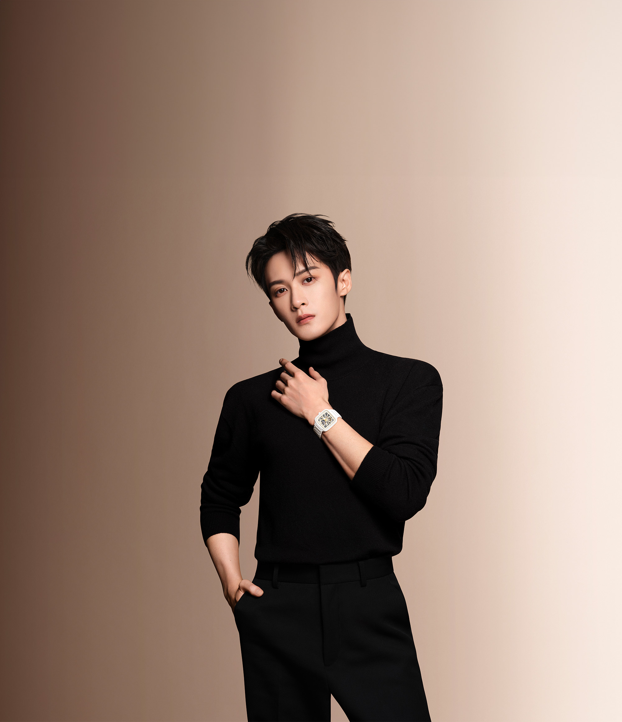 Tan Jianci is wearing the striking Rado True Square Open Heart, a perfect mix of elegant design and advanced technology. Part of the Rado True Square collection, the watch features a square high-tech ceramic case with soft corners. The intricate dial, with golden coloured accents and 12 diamond indexes, catches the light beautifully. Inside, the Rado calibre R734 automatic movement offers an 80-hour power reserve, an anti-magnetic Nivachron™ hairspring and exceeds standard testing requirements being tested and adjusted in five positions,ensuring accurate and reliable performance. With its combination of precision and style, the True Square Open Heart reflects Tan Jianci’s versatile personality, showing both ease and intensity.