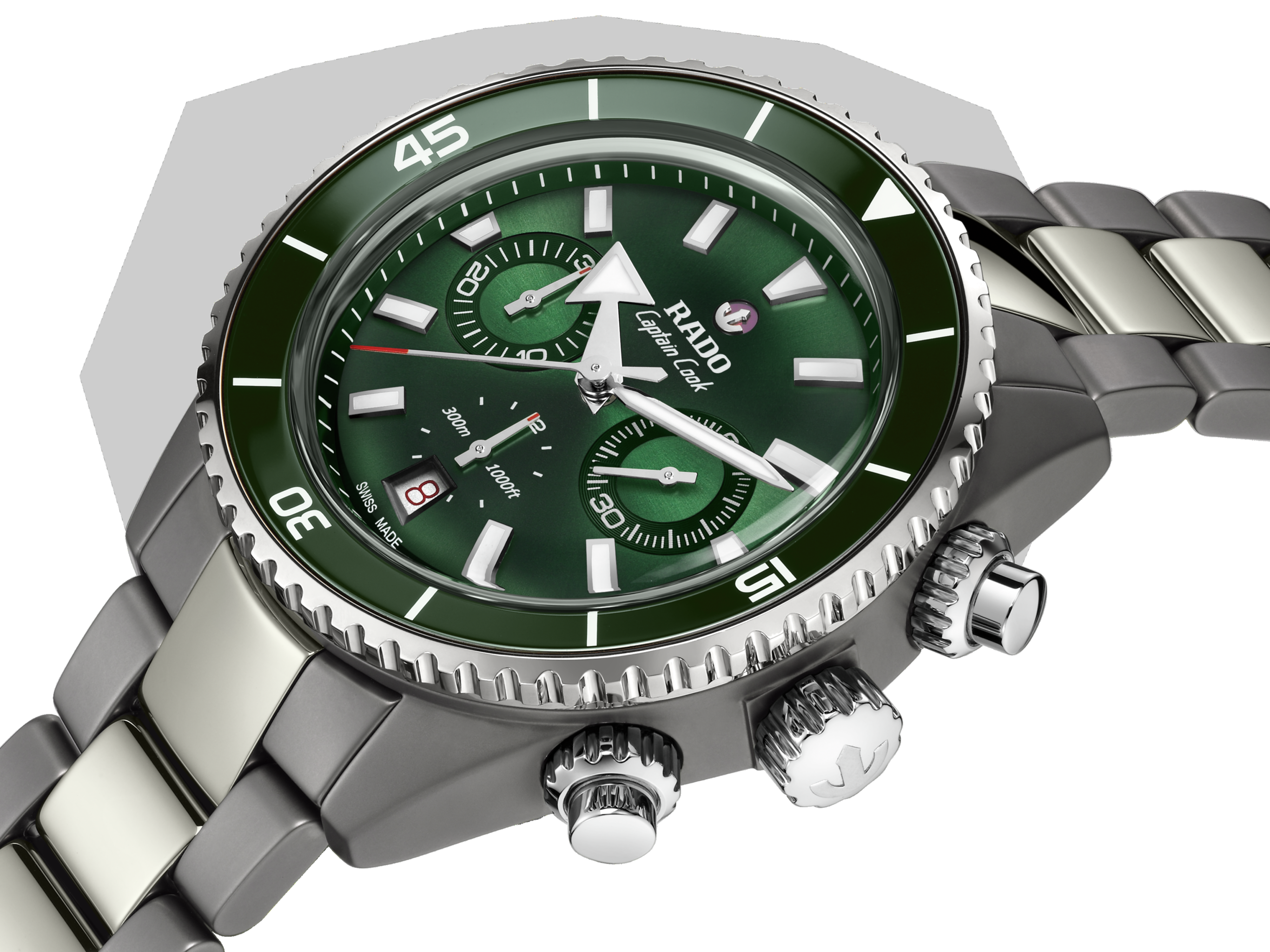 Precision forged through extreme engineering—the Captain Cook High-Tech Ceramic Chronograph is the result of uncompromising processes and material innovation. Born from pressure, heat, and technical mastery, its construction pushes the boundaries of what’s possible in modern watchmaking. The 43 mm monobloc case is crafted from plasma high tech ceramic, the result of an extreme transformation process where white ceramic is exposed to gases activated at 20,000 degrees Celsius. In this searing environment, its molecular structure is altered, giving rise to a unique metallic finish—achieved without a single particle of metal. A feat of pure material science, paired with a stainless-steel turning bezel and a polished green ceramic insert, engraved with white Super-LumiNova® markers. Topped with a box-shaped sapphire crystal, forged at temperatures over 2,000°C and coated with anti-reflective layers on both sides, the crystal offers exceptional clarity and scratch resistance, only surpassed by diamond in hardness. At its core beats the Calibre R801, a self-winding chronograph movement developed for uncompromising reliability. Engineered with 37 jewels and regulated in five positions, it ensures precise timekeeping under the most demanding conditions. The movement is equipped with an antimagnetic Nivachron™ hairspring. With a robust 59-hour power reserve, the R801 exemplifies technical mastery and mechanical resilience, embodying the spirit of Swiss engineering and Rado’s continued pursuit of horological excellence. The black dial reflects a pure expression of function and form. Rhodium coloured indexes and hands are coated with white Super-LumiNova®, while three precisely arranged counters display 12-hour, 30-minute, and small seconds functions. A date guichet at 6 o’clock and the iconic rotating anchor on a ruby backplate complete the dial’s mechanical signature. The design is completed by a matt and polished black high-tech ceramic bracelet, secured by a titanium 3-fold clasp for a seamless fit. Water-resistant to 30 bar (300 m), the Captain Cook High-Tech Ceramic Chronograph redefines adventure—uniting Swiss precision with contemporary elegance.