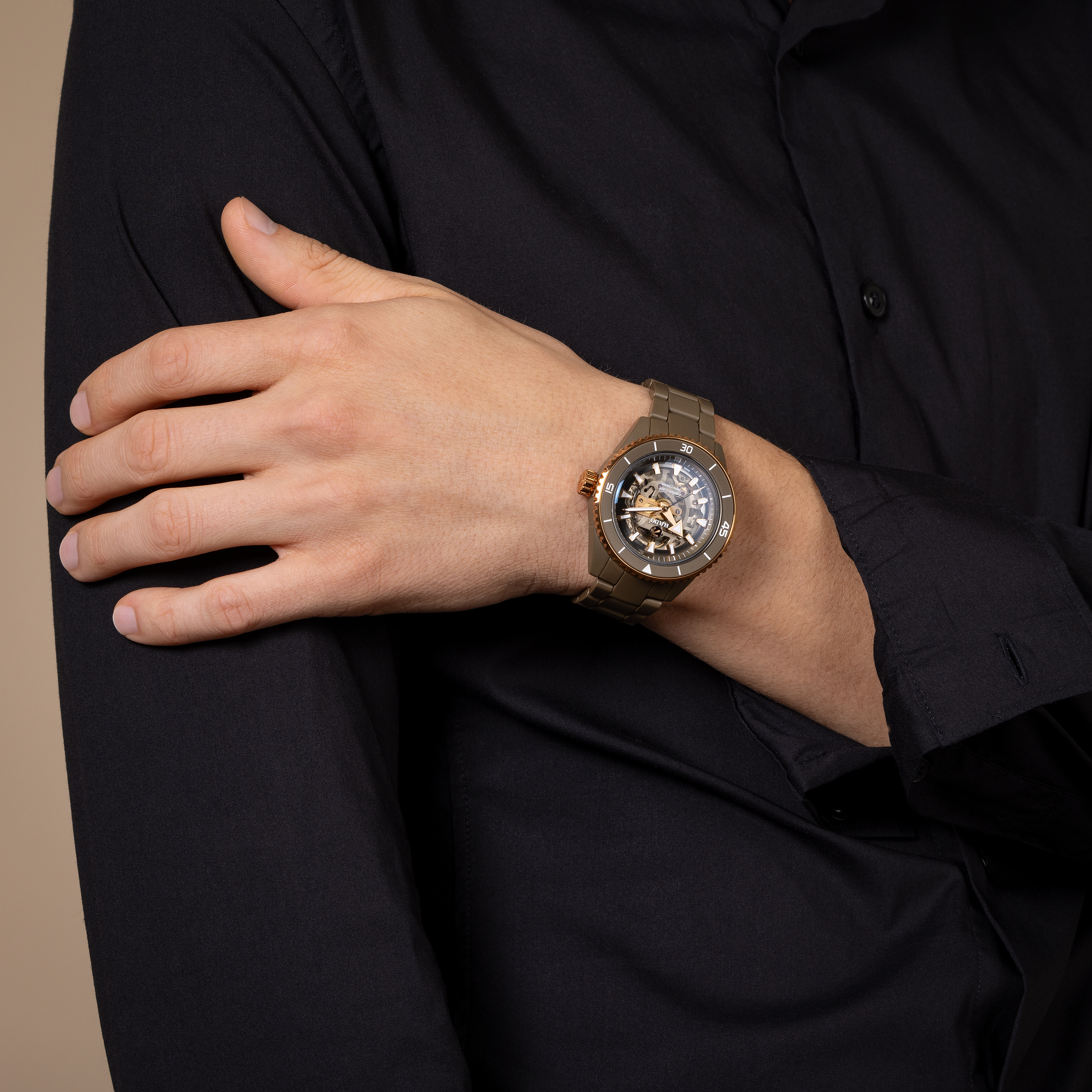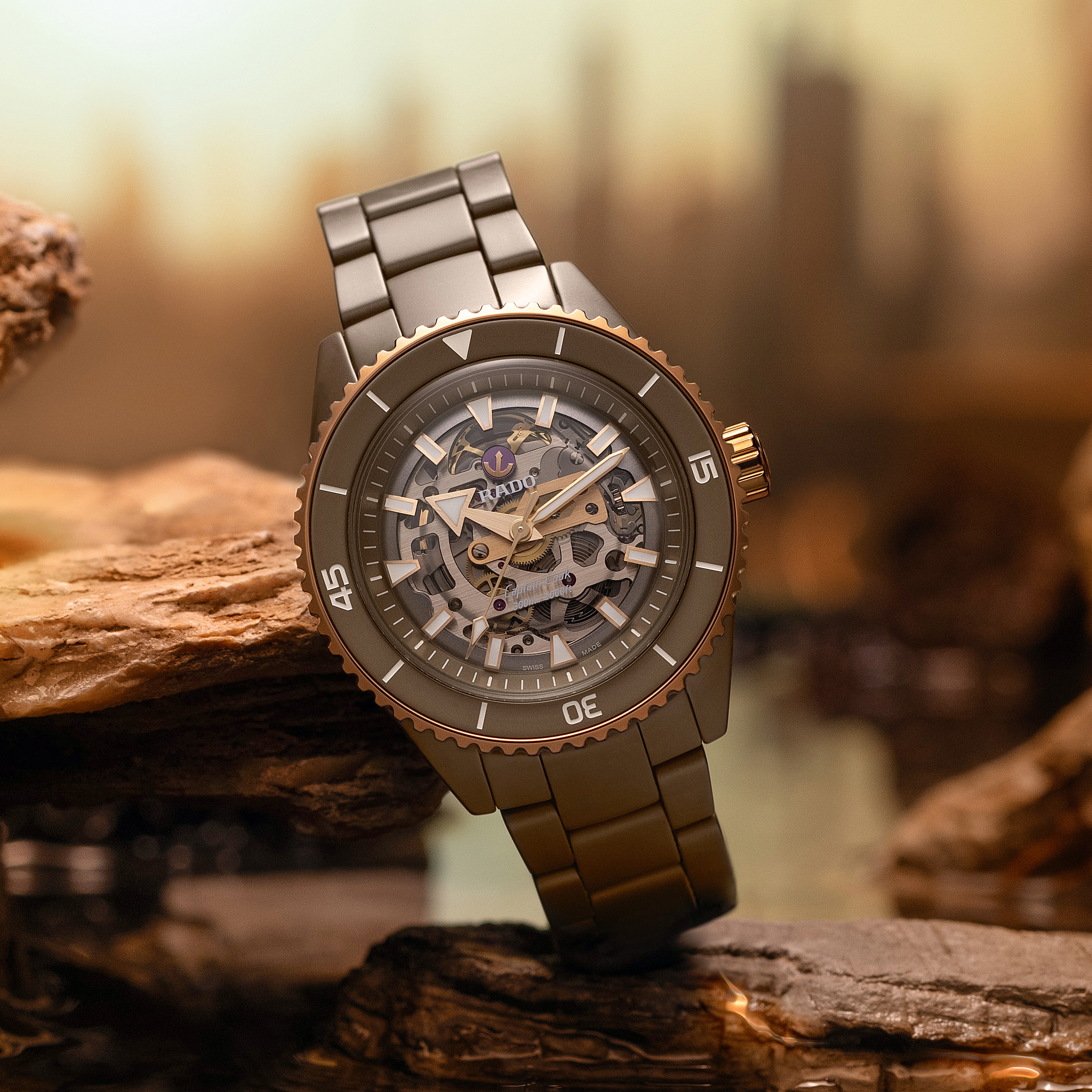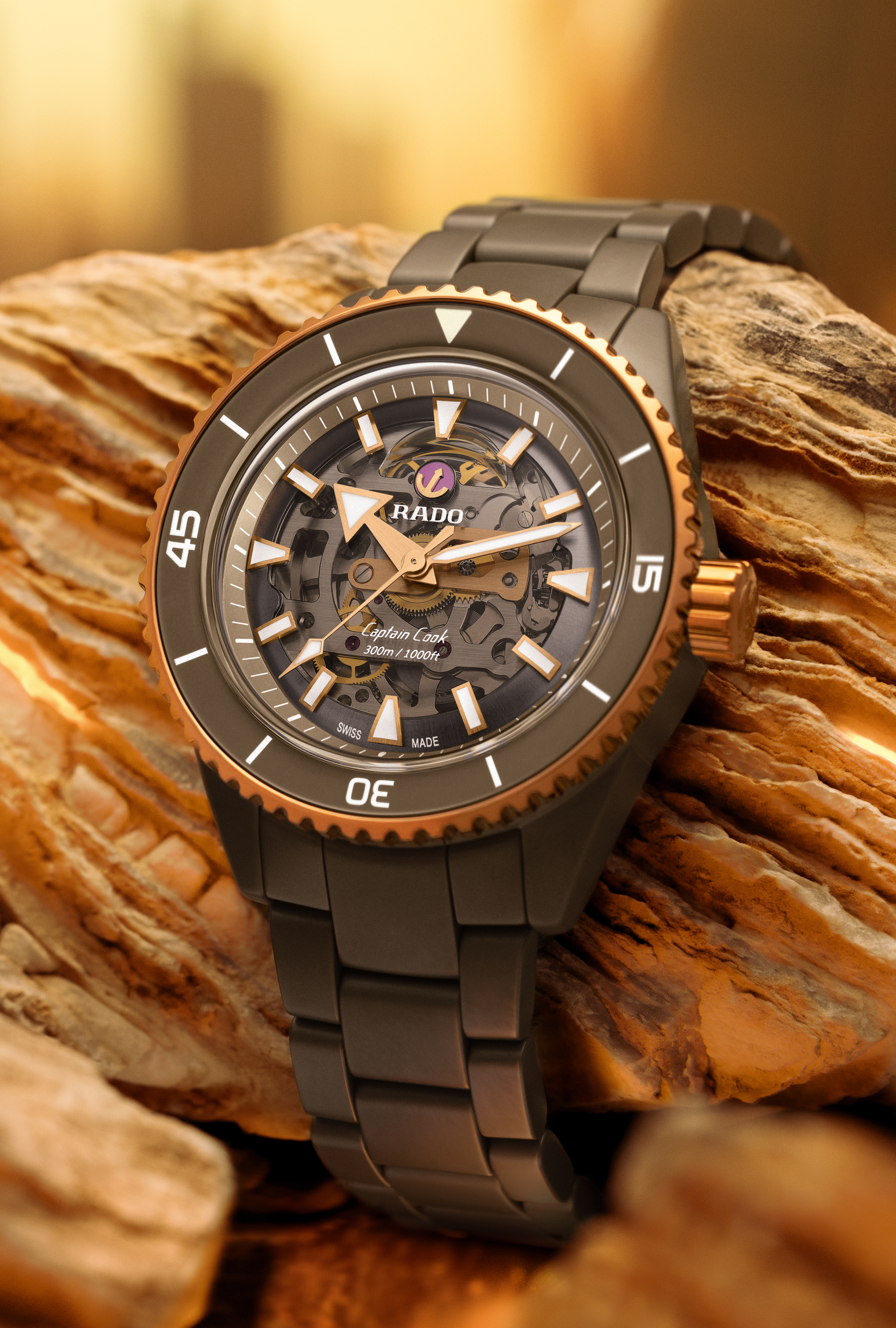 The Captain Cook High-Tech Ceramic Skeleton showcases its innovative R808 movement, a marvel of contrasts, know-how and clever geometry, that allows a distinct view of the various parts. It’s equipped with an anti-magnetic and highly reliable Nivachron™ hairspring that has been fully tested in five positions and provides up to 80 hours of power reserve. The superb matt olive-green high-tech ceramic monobloc case is topped by a rose-gold-colour rotatable bezel with a matt olive-green ceramic insert to match the case and lugs, for visual harmony. The dial is clear and spartan, with generous geometric indices and hour/minute/second hands in rose-gold tones, treated with white Super-LumiNova® for best readability in low-light conditions. Thanks to a matching olive green high-tech ceramic triple-row bracelet with a titanium three-fold clasp, the new Captain Cook remains loyal with you through the most rugged and demanding of your explorations.