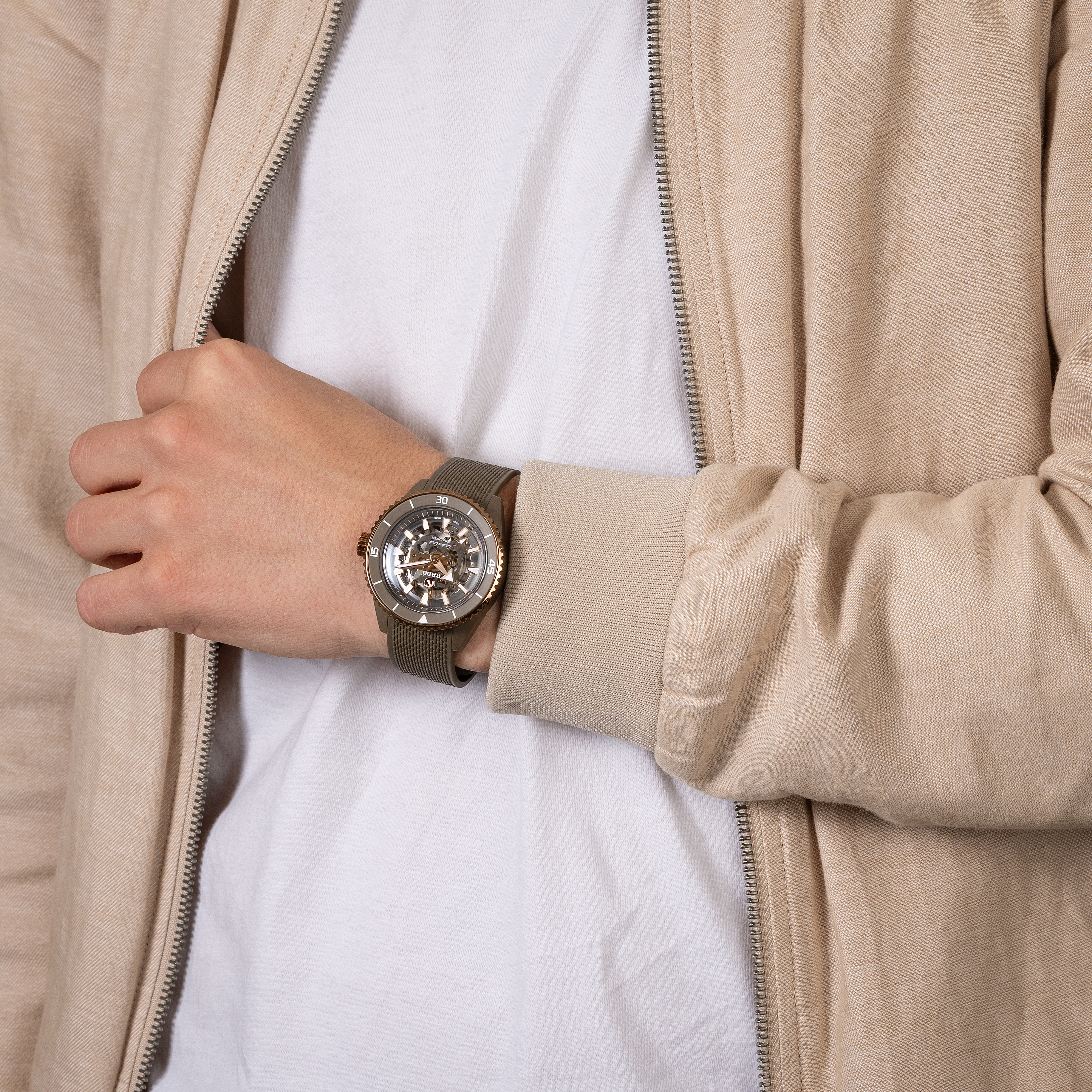 The Captain Cook High-Tech Ceramic Skeleton showcases its innovative R808 movement, a marvel of contrasts, know-how and clever geometry, that allows a distinct view of the various parts. It’s equipped with an anti-magnetic and highly reliable NivachronTM hairspring that has been fully tested in five positions and provides up to 80 hours of power reserve. The superb matt olive-green high-tech ceramic monobloc case is topped by a rose-gold-colour rotatable bezel with a matt olive-green ceramic insert to match the case and lugs, for visual harmony. The dial is clear and spartan, with generous geometric indices and hour/minute/second hands in rose-gold tones, treated with white Super-LumiNova® for best readability in low-light conditions. Thanks to a matching olive-tone rubber strap and the high-tech ceramic buckle cover, the new Captain Cook shows its sporty side.