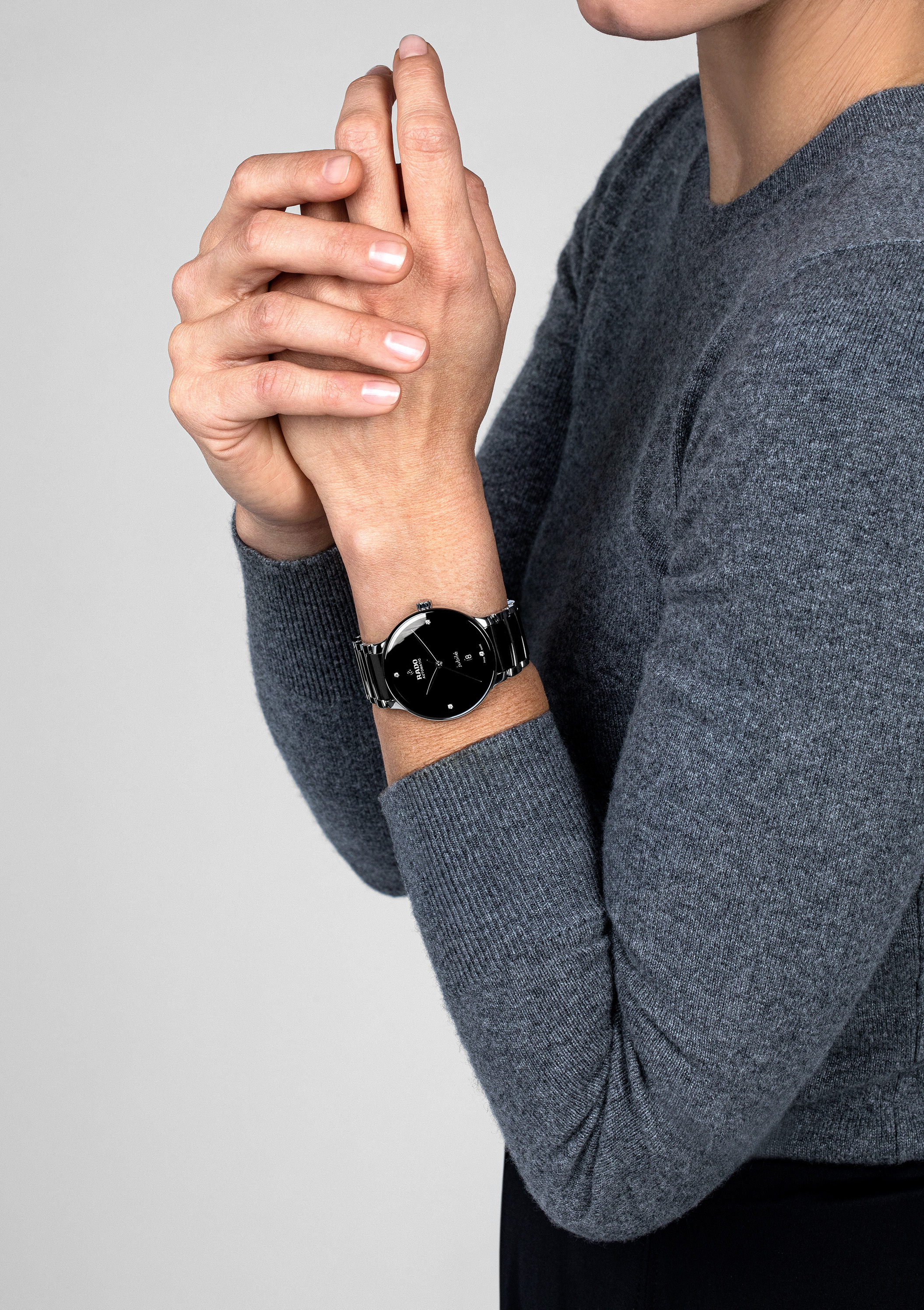 The classic Centrix Automatic Diamonds watch has been reworked not only technically, but also aesthetically. The modified model has a rounded sapphire crystal that extends all the way to the edge, as well as a curved case blending with the curved crystal edge. The adjusted case lugs and the bracelet made of polished stainless steel with black high-tech ceramic middle links complete the overall appearance of this iconic timepiece. The black lacquered dial with 4 diamonds, emphasised with the printed “jubilé” logo, matches perfectly with the rhodium-coloured hands. Inside, the three-hand calibre R763 movement exceeds standard accuracy test requirements from 3 to 5 positions, thanks to its antimagnetic Nivachron™ hairspring for increased reliability and accuracy. The watch is water resistant down to 50 m and offers 80 hours of power reserve.