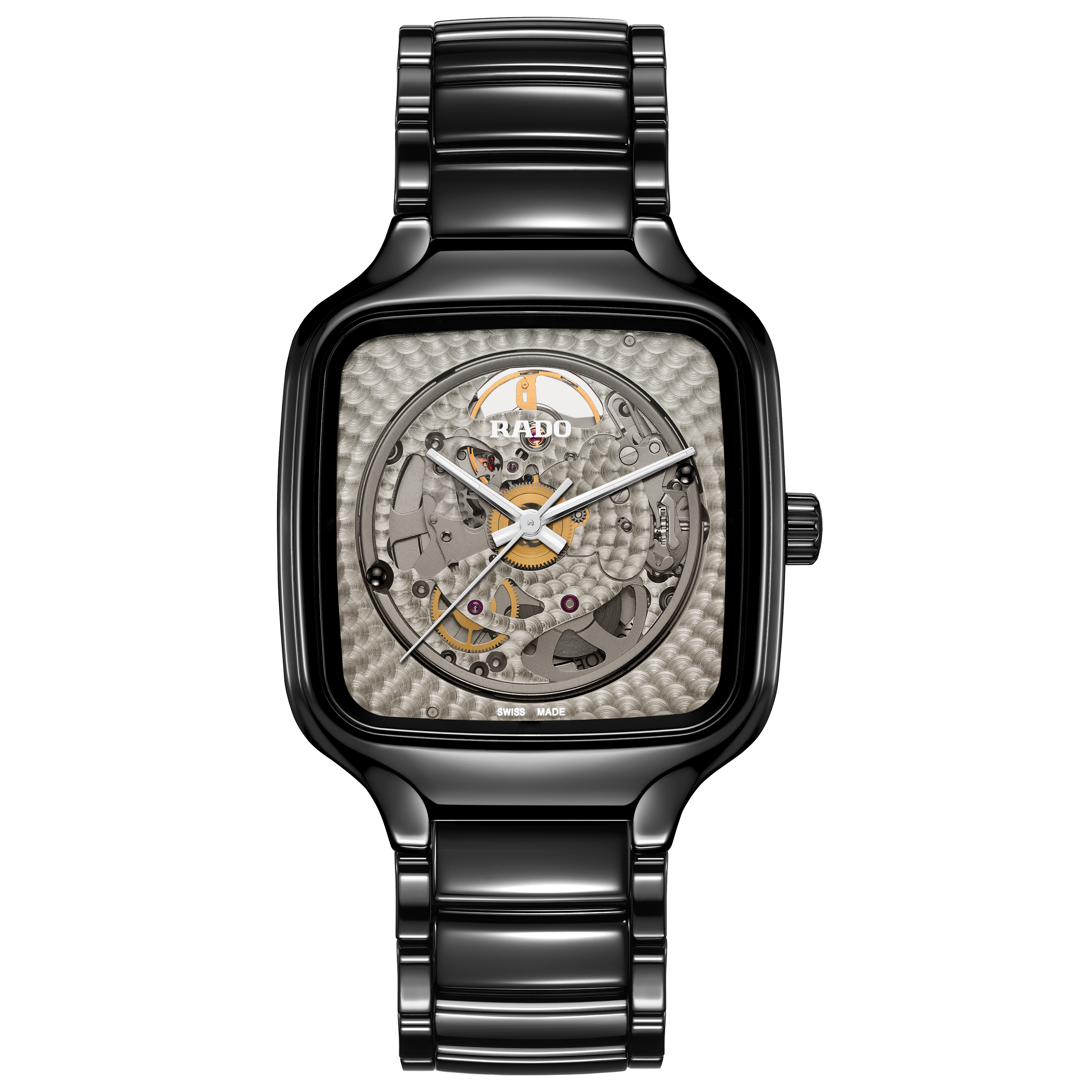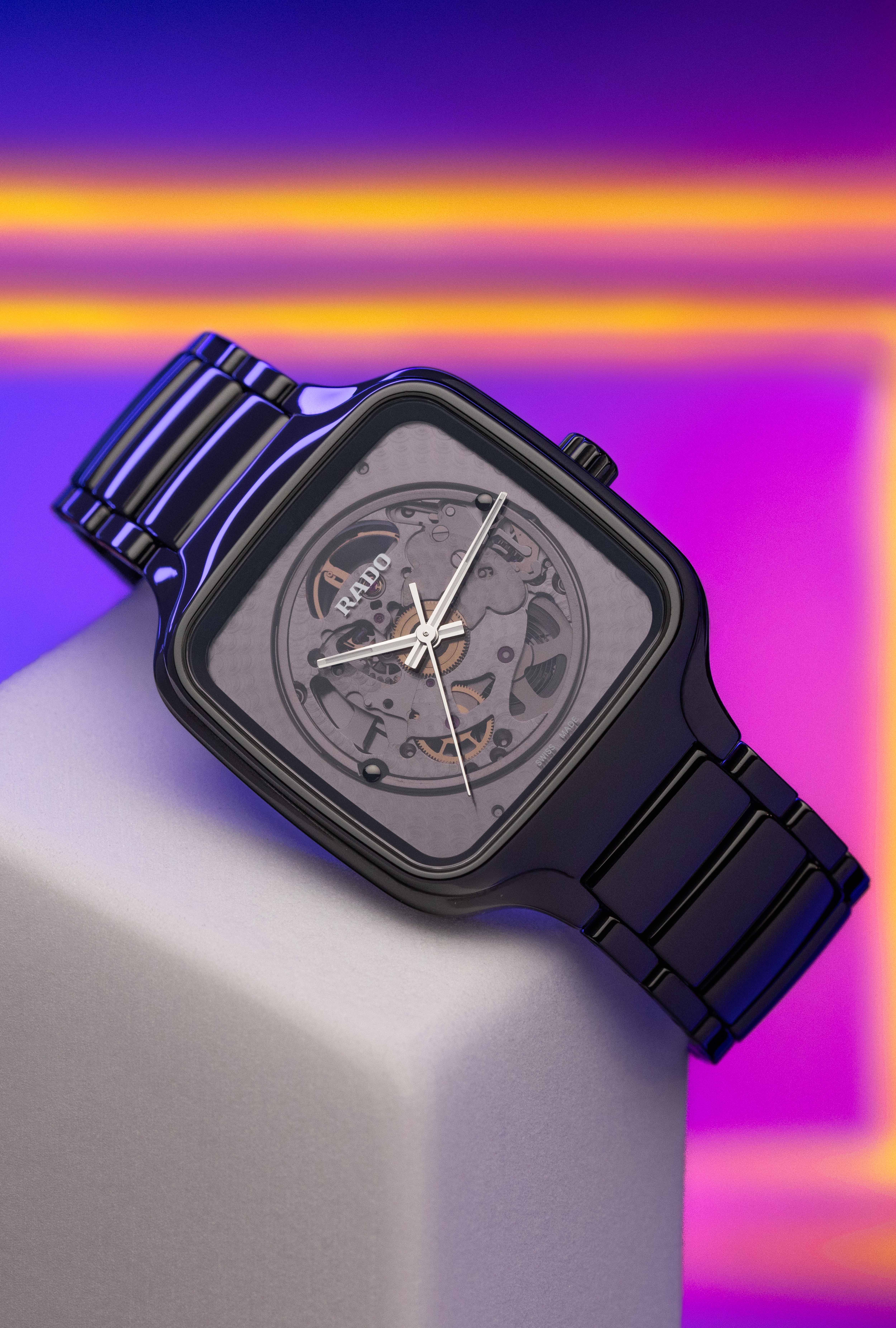 When it is exposed to sunlight, the True Square’s dial darkens. But as the sun goes down – as it invariably does – the dial shade evolves into grey and finally becomes transparent, revealing the Rado calibre R734 at the heart of the watch.