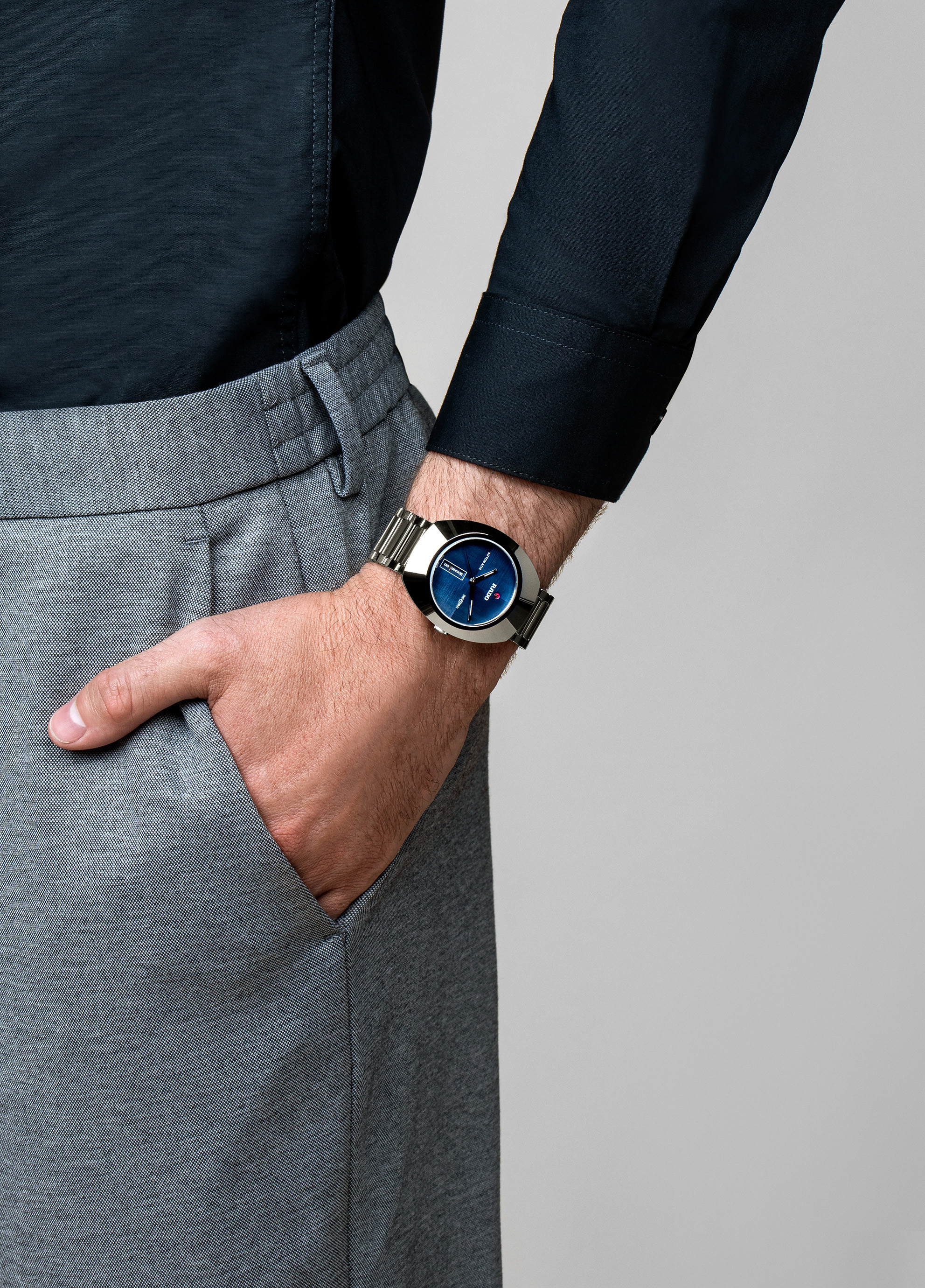 The unique DiaStar Original has a diameter of 38 mm and is water resistant down to 100 m. Framed by an ultra-shiny Ceramos™ coiffe with polished angles and detailing set over a matching, monochrome stainless-steel case, this beautiful watch is rounded off with a parallel-stripe-faceted sapphire crystal. Specifications include a blue brushed dial with two directions, rhodium coloured hands with white Super-LumiNova®, and a day date display matching the colour of the dial. Inside, the Rado R764 automatic movement with antimagnetic Nivachron™ offers 80 hours of power reserve. The bracelet is made of polished and brushed stainless steel.