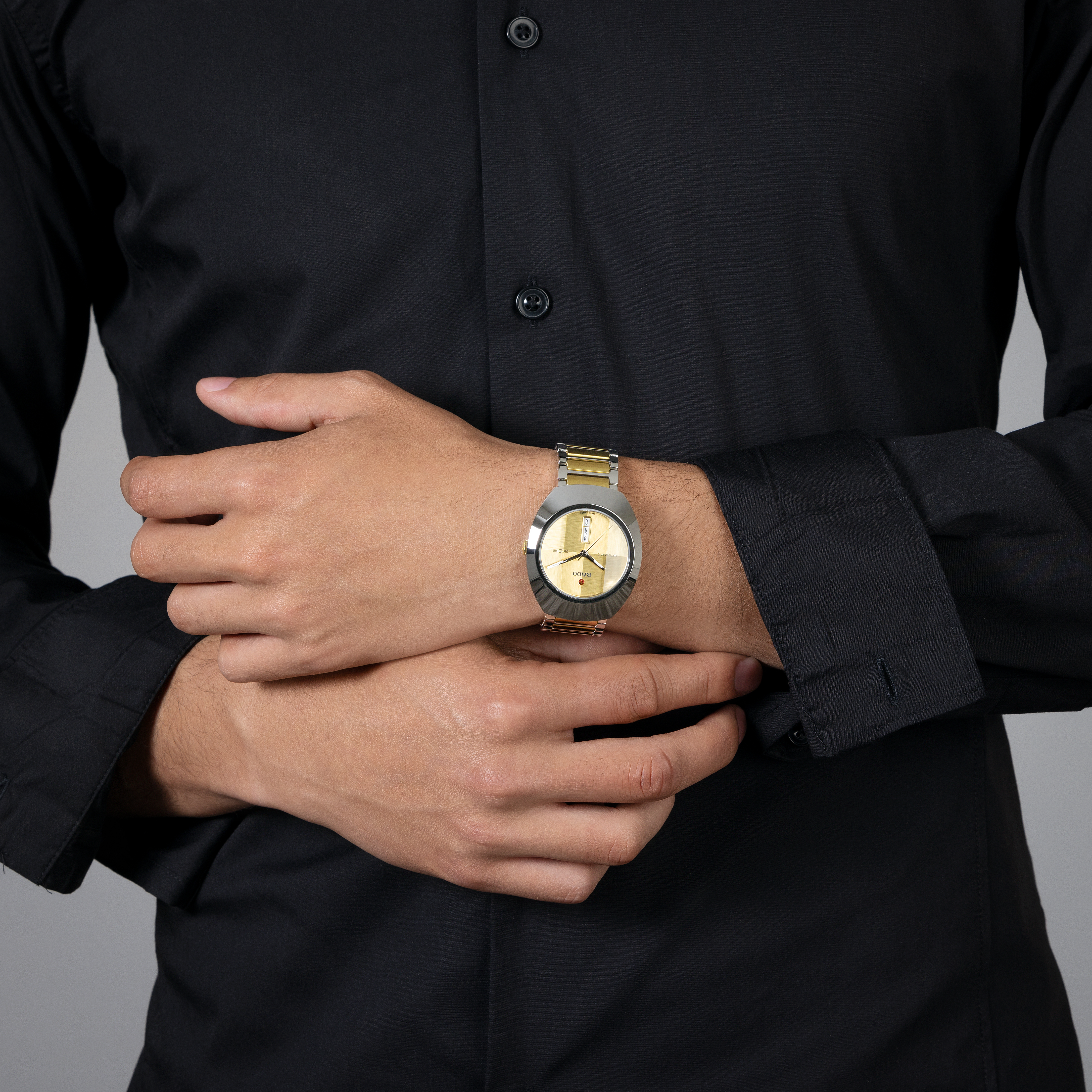 The unique DiaStar Original has a diameter of 38 mm and is water resistant down to 100 m. Framed by an ultra-shiny Ceramos™ coiffe with polished angles and detailing set over a matching, monochrome stainless-steel case, this beautiful watch is rounded off with a parallel-stripe-faceted sapphire crystal. Specifications include a gold brushed dial with two directions, rhodium-coloured hands with white Super-LumiNova®, and a white day date display. The Rado R764 automatic movement offers 80 hours of power reserve, with an antimagnetic Nivachron™ balance spring. The bracelet is made of polished and brushed stainless steel, while the middle links are yellow gold PVD coated.