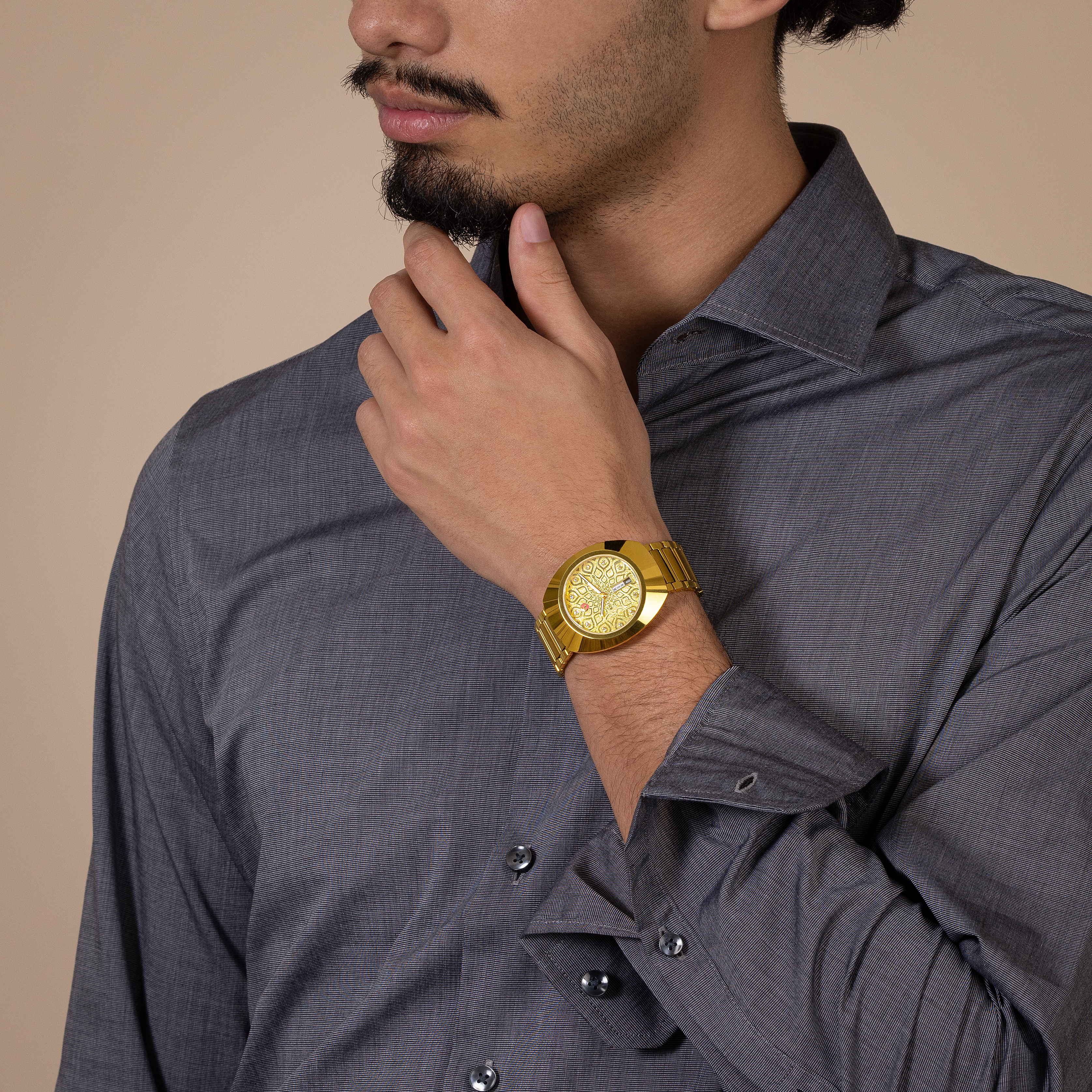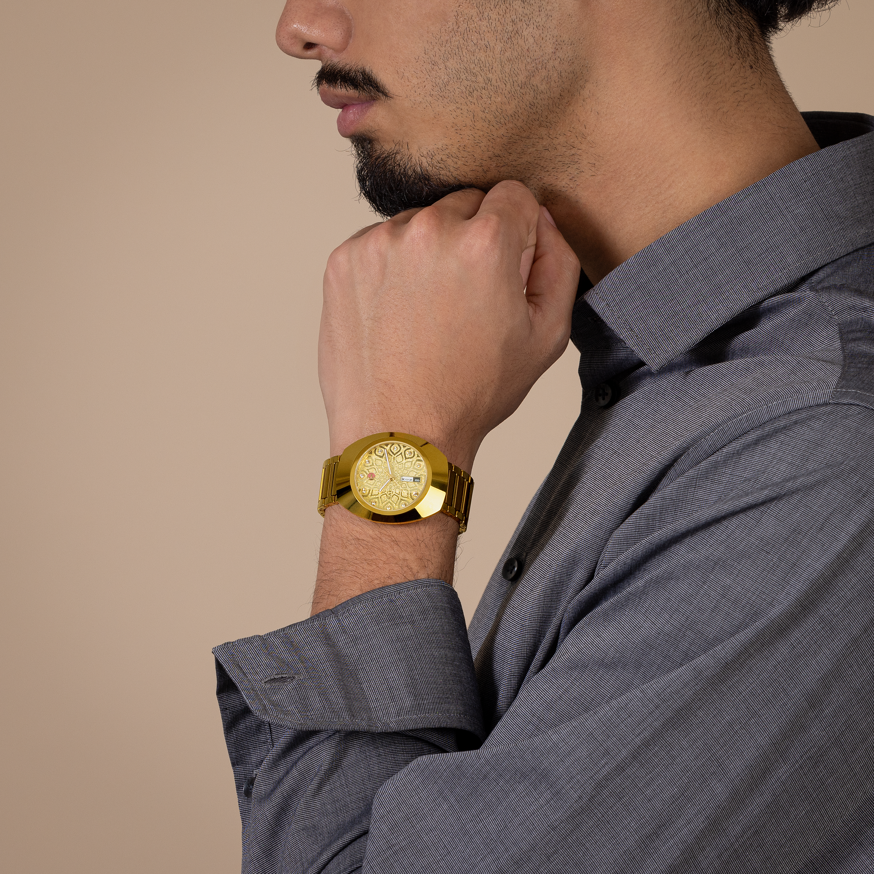 The unique DiaStar Original has a diameter of 38 mm and is water resistant down to 100 m. Framed by an ultra-shiny yellow gold couloured Ceramos™ coiffe with polished angles and detailing set over a matching, yellow gold couloured PVD coated stainless-steel case, this beautiful watch is rounded off with a vertical faceted sapphire crystal. Specifications include yellow coloured hands with white Super-LumiNova®, and a white day display and a black date display. The dial features eleven light cubic zirconia, on a yellow coloured harmonic pattern on a diamond powder decoration. The Rado R764 automatic movement offers 80 hours of power reserve, with an antimagnetic Nivachron™ balance spring. The bracelet is made of yellow gold PVD coated polished and brushed stainless steel.