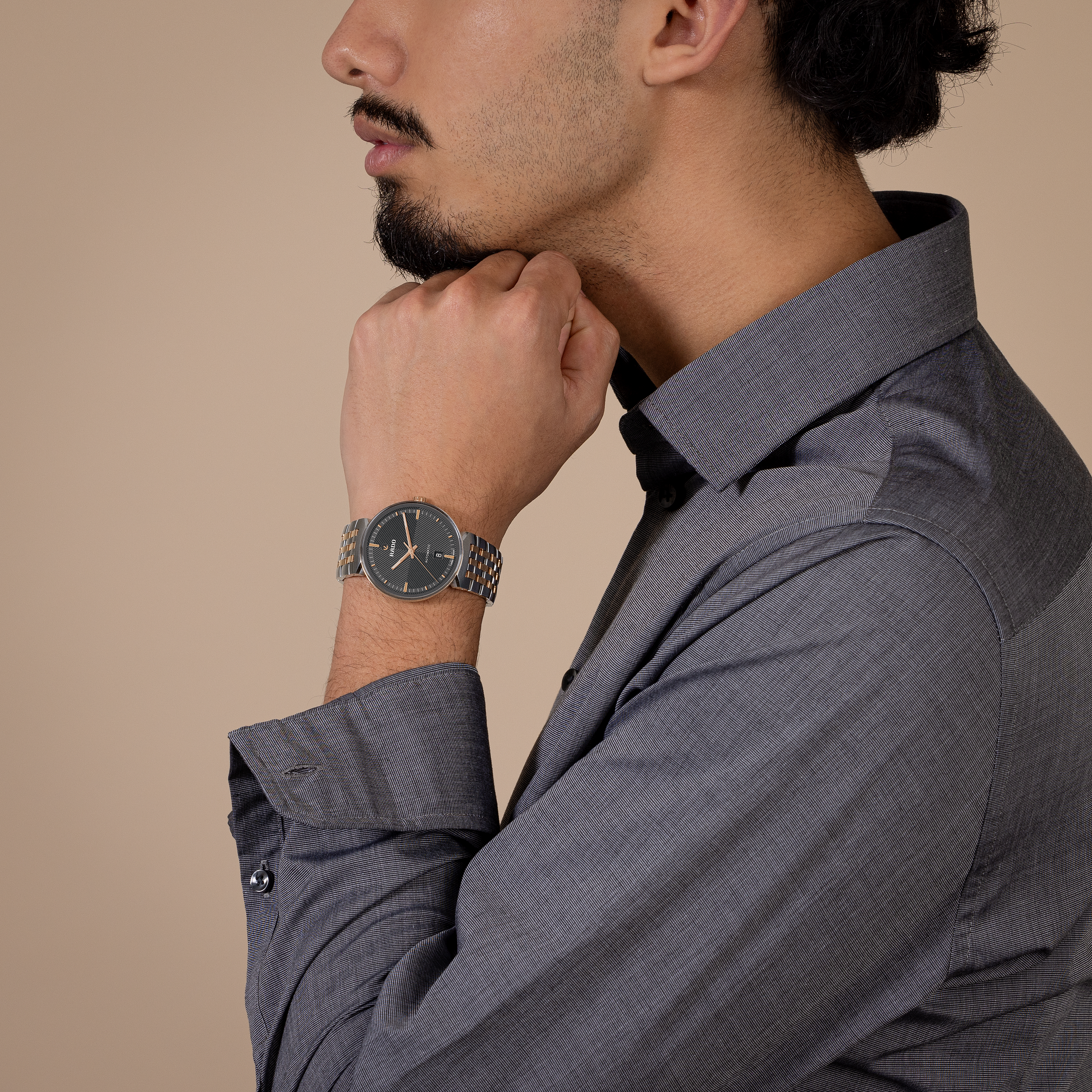 Discover the timeless blend of Swiss precision and elegance with the iconic Rado Florence. The 39 mm case is crowned with an edge-to-edge sapphire crystal, featuring a metallised edge that matches the stainless steel case. This sapphire crystal functions both as the protective front and as a bezel, seamlessly integrated into the case to enhance the Florence iconic refined profile. Serving as a theatre scene, the grey dial showcases extreme attention to detail with its sophisticated embossed pattern. The contrasting rose gold-coloured applied hour markers, topped by the moving Rado anchor symbol, finished with brushing and polishing, create a hypnotising contrast against the grey background. The case is complemented by a bi-tone bracelet combining polished rose gold-coloured PVD-coated stainless steel links with brushed stainless steel links, secured by a stainless steel three-fold clasp. Beneath the box-shaped sapphire crystal case back lies the soul of the Florence: the Automatic R763 calibre. Finely regulated in five positions and featuring a Nivachron™ hairspring, this movement delivers a high level of accuracy and a robust 80-hour power reserve, underlining Rado's commitment to perfection.