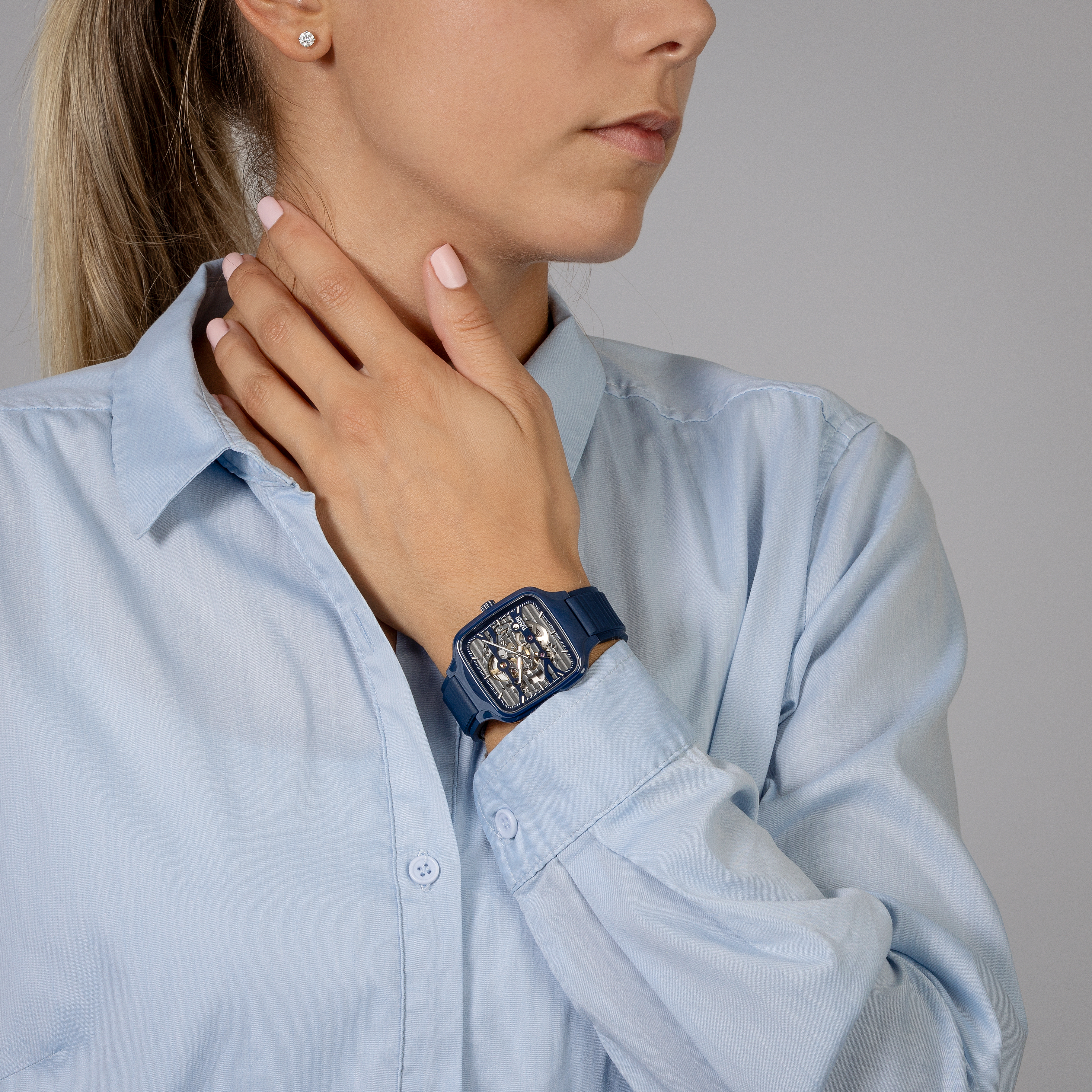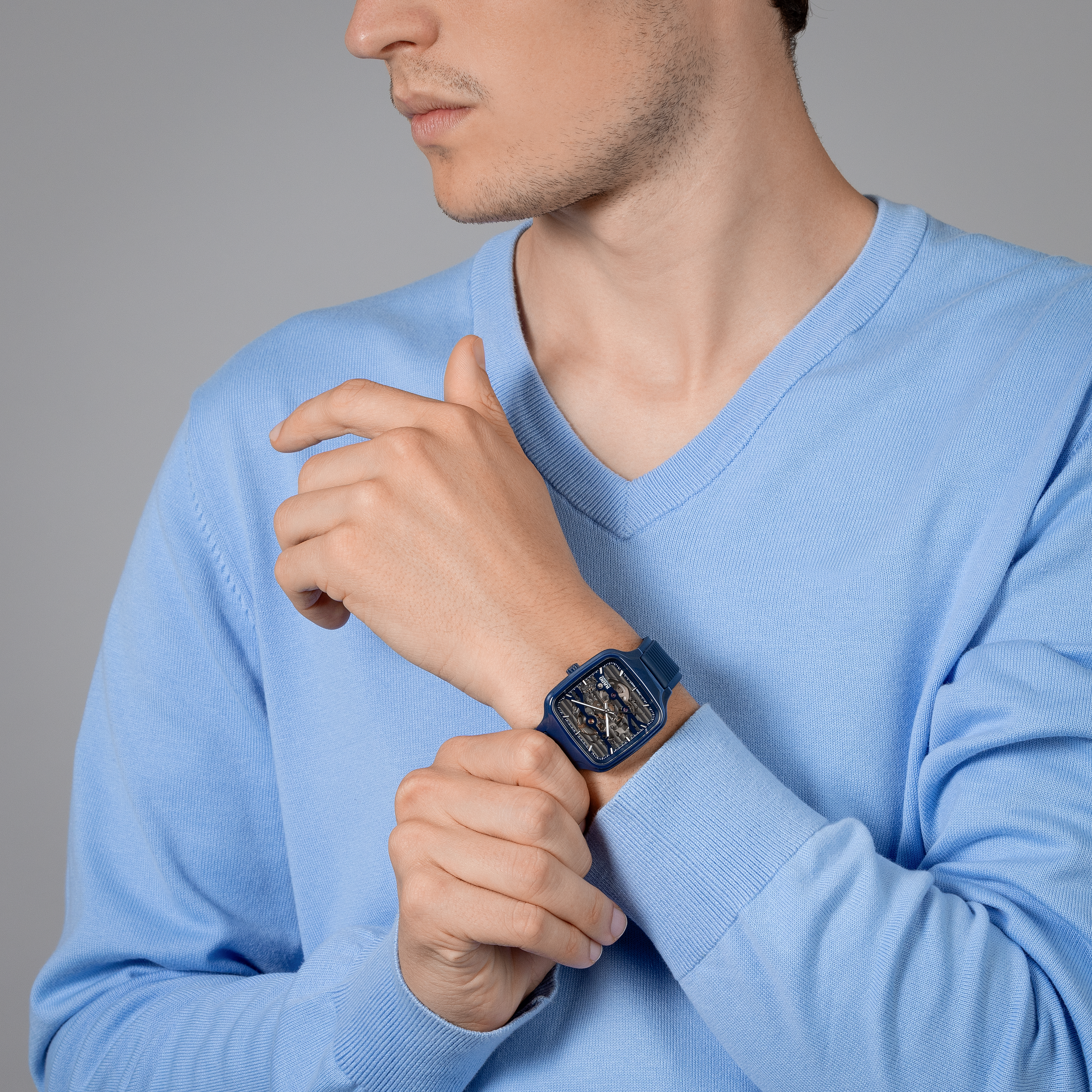 Experience the perfect fusion of artistry and precision with the True Square Skeleton. What catches the eye is the skeletonised movement R808 and the two-level dial, which practically merges with the movement. This state-of-the-art calibre delivers outstanding precision combined with enhanced resistance to magnetic fields with its reliable NivachronTM hairspring and has a power reserve of 80 hours. The skeletonised dial with sophisticated indices and hour/minute/second hands in rhodium tones, treated with white Super-LumiNova® for best readability in low-light conditions. With the 38mm monobloc case made of polished navy blue high-tech ceramic and the bracelet made of navy blue rubber, the True Square Skeleton presents characteristic Rado features in a fascinating form.